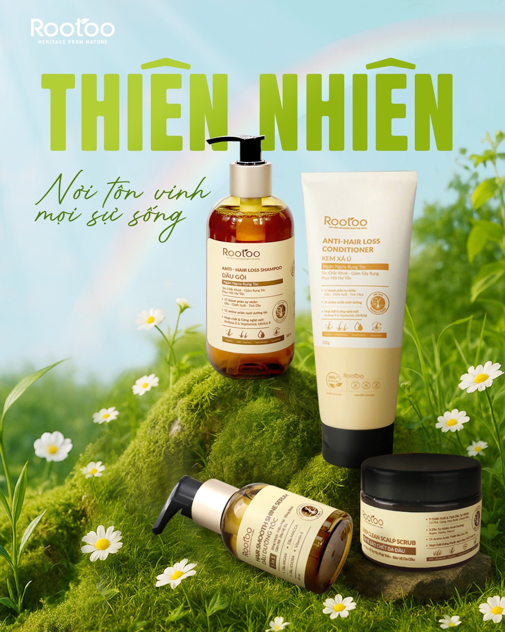 - ROOTOO kết tinh tinh hoa thảo mộc và hoạt chất công nghệ từ tự nhiên, tạo nên giải pháp chăm sóc cơ thể lành tính – an toàn – bền vững, giúp mỗi người nuôi dưỡng vẻ đẹp nguyên bản theo cách của riêng mình.