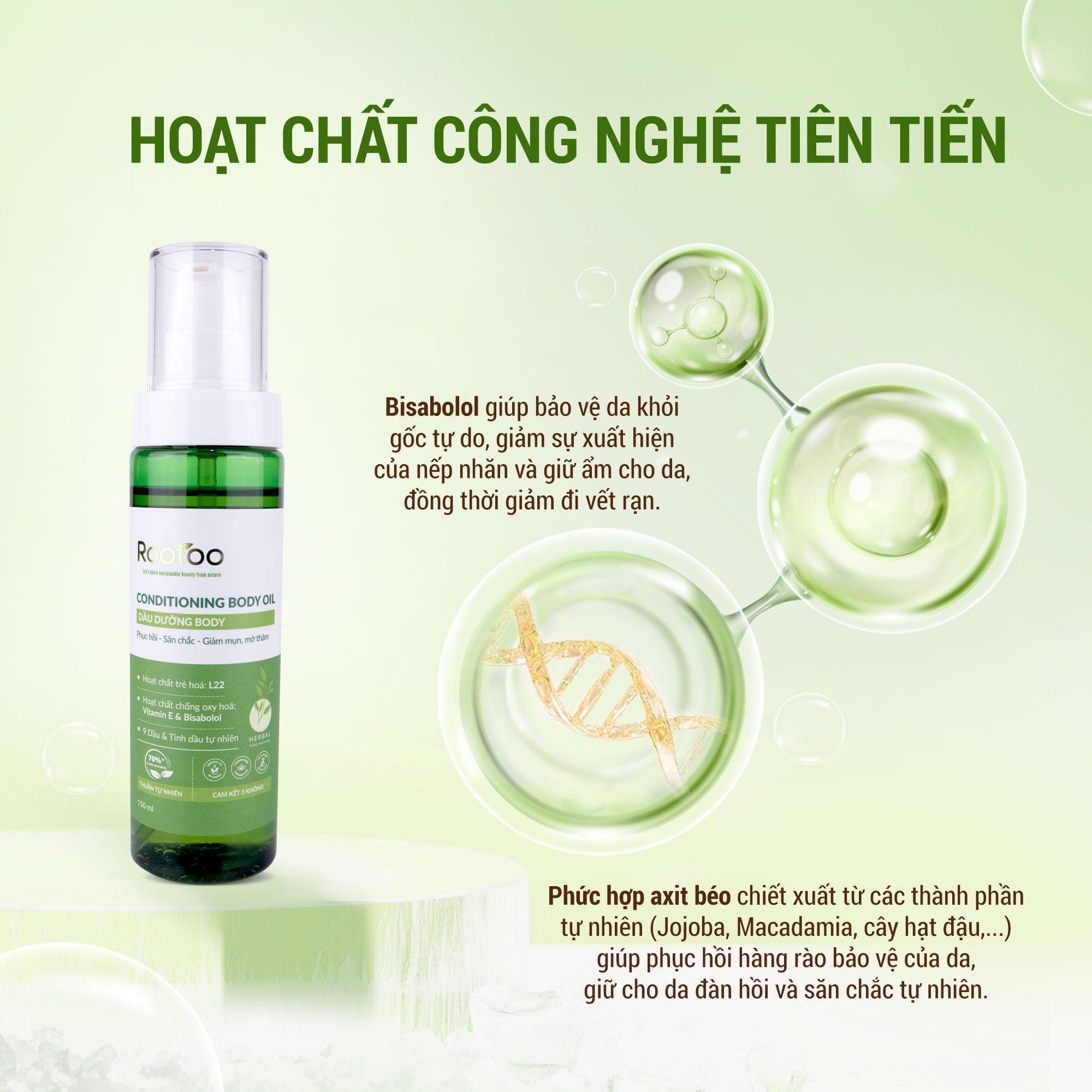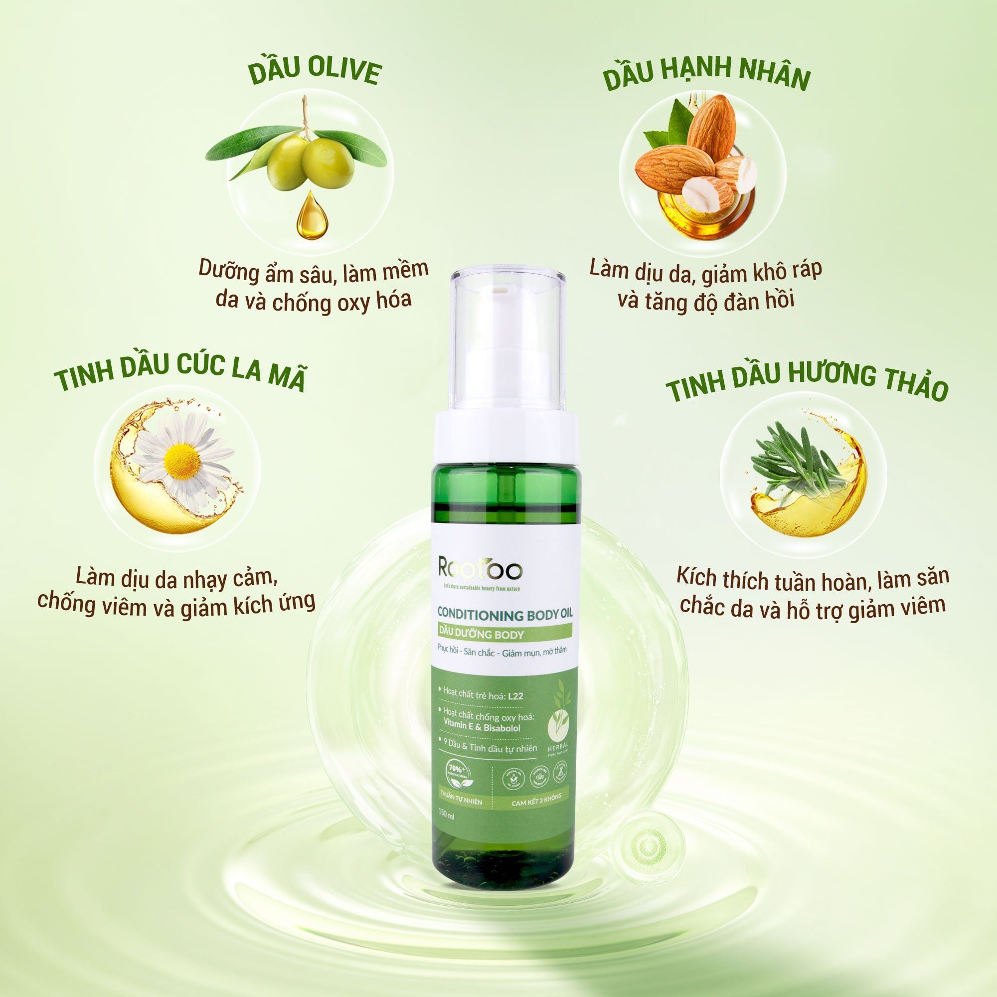 Dầu Dưỡng Body ROOTOO là giải pháp dưỡng da toàn thân từ thiên nhiên giúp dưỡng ẩm sâu, làm mềm da, phục hồi làn da khô ráp và ngăn ngừa tình trạng rạn da, lão hóa da hiệu quả. Với công thức kết hợp 9 loại dầu & tinh dầu tự nhiên cùng hoạt chất chống oxy hóa mạnh mẽ, sản phẩm mang lại làn da căng mịn – săn chắc – tràn đầy sức sống chỉ sau vài lần sử dụng.