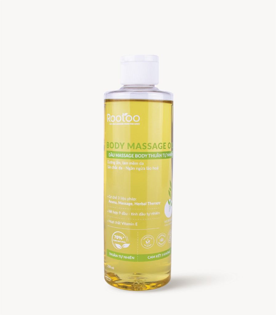 Dầu Massage Body ROOTOO là sự kết hợp hài hòa từ các thành phần thảo dược tự nhiên như tinh dầu cam, oải hương, hoa hồng, cúc La Mã,... giúp dưỡng ẩm – làm mềm da, hỗ trợ ngăn ngừa lão hóa – tái tạo cấu trúc da, đồng thời mang đến cảm giác thư giãn, nhẹ nhàng khi sử dụng. Da trở nên săn chắc, đàn hồi và tươi sáng hơn mỗi ngày – bạn sẽ cảm nhận rõ sự thay đổi ngay từ lần đầu sử dụng.