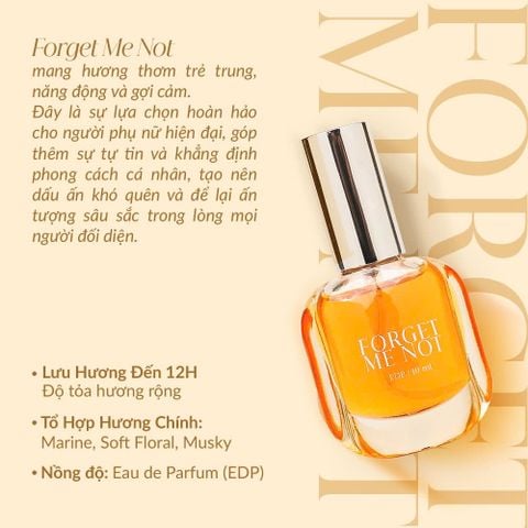 Nước hoa nữ Forget Me Not là nước hoa dành cho phái nữ, giúp tạo hương thơm cho cơ thể, mang hương thơm trẻ trung, năng động và gợi cảm.