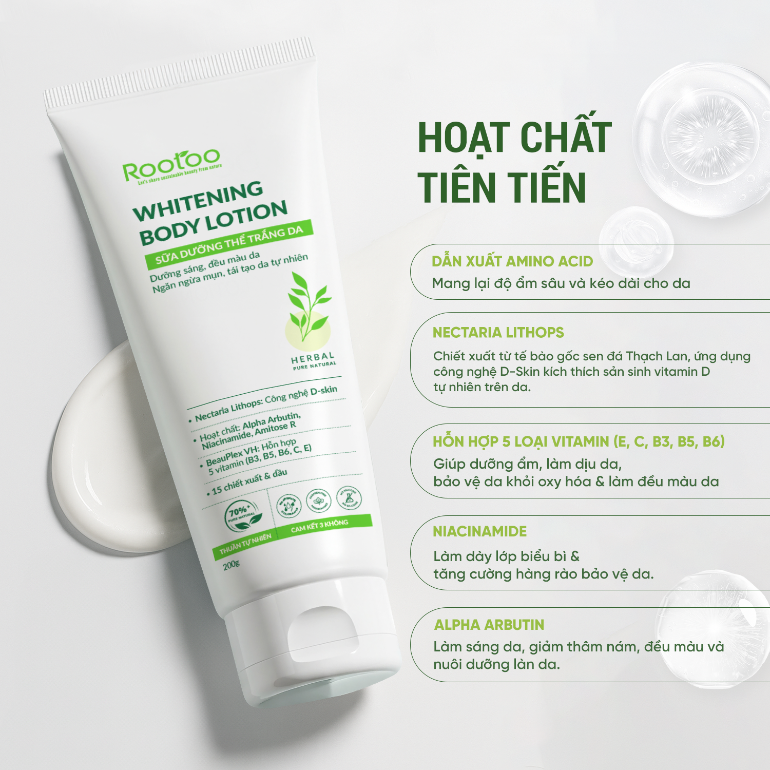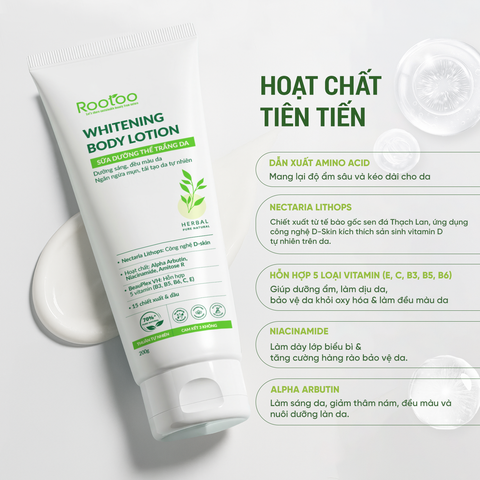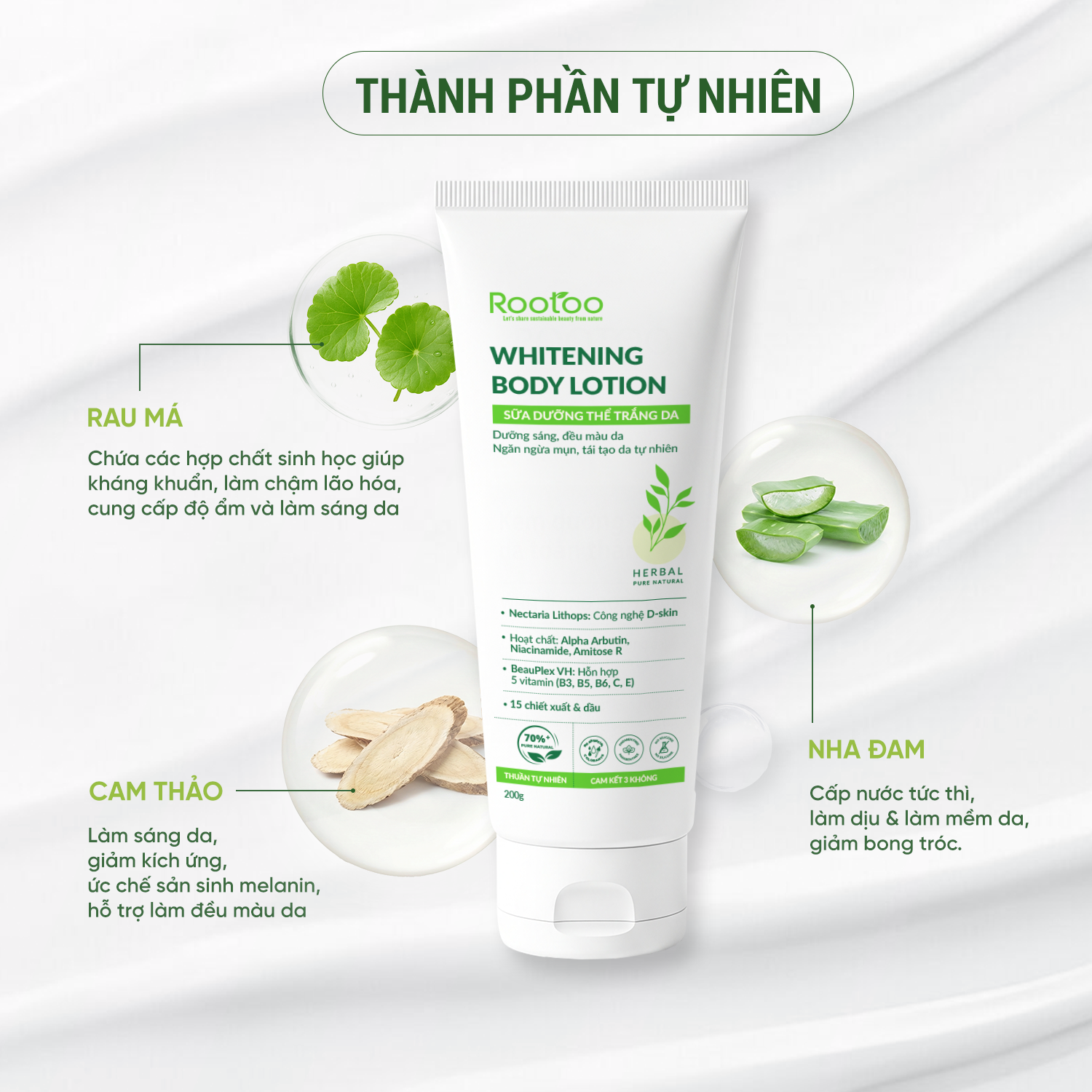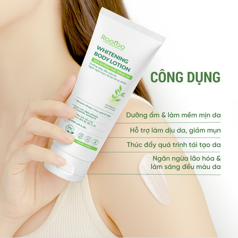Sữa Dưỡng Thể Trắng Da Rootoo là sự kết hợp hoàn hảo của 15 thành phần thảo dược Việt Nam và hoạt chất dưỡng sáng như Alpha Arbutin, Niacinamide, Amitose R, kết hợp công nghệ D-Skin tối ưu hóa quá trình sản xuất vitamin D, tái tạo làn da trắng sáng, ẩm mịn, cải thiện quá trình oxy hóa, đều màu, khỏe mạnh.
